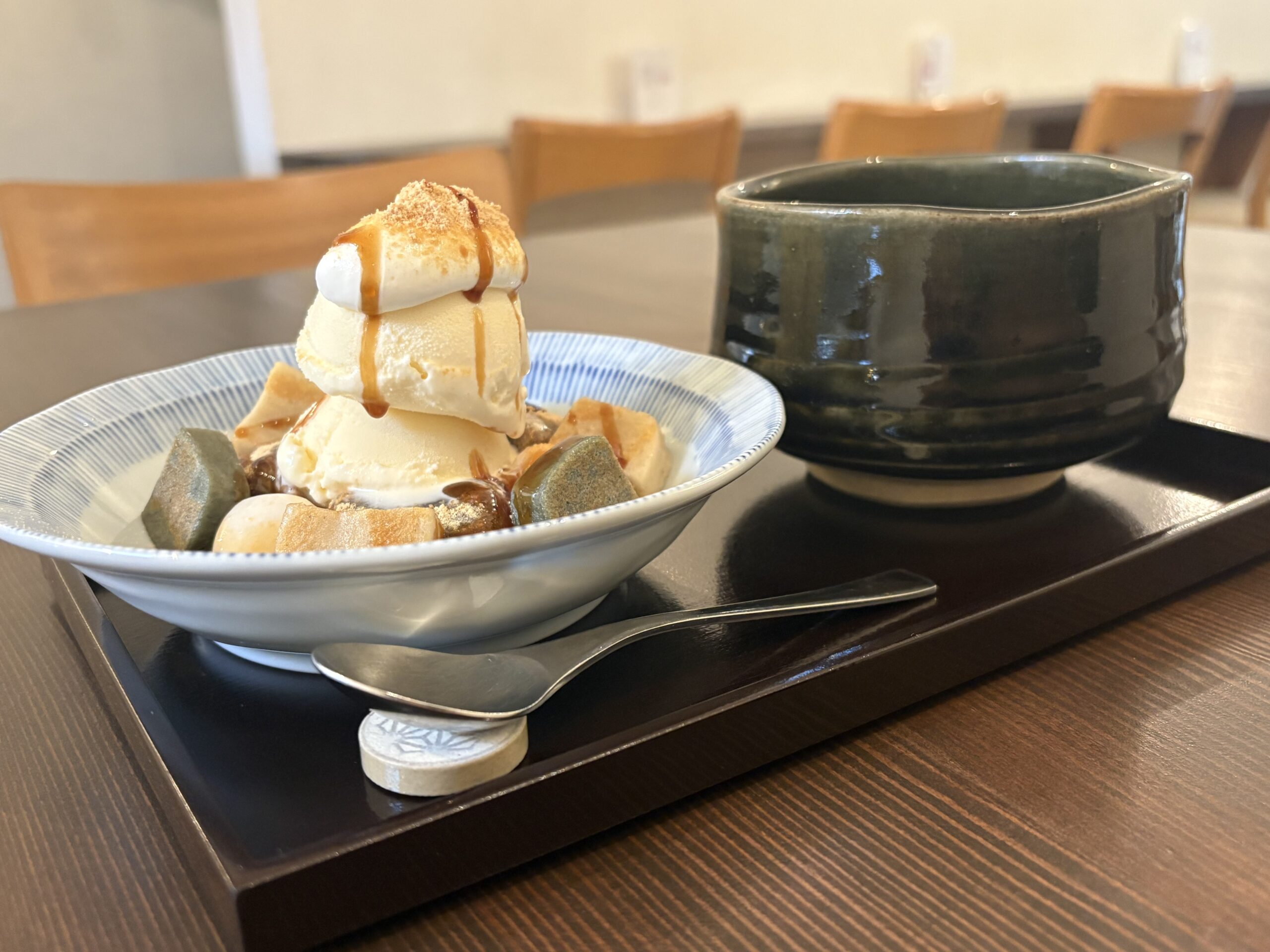 焼き生麩、わらび餅、白玉にバニラアイスときな粉、そしてみたらしのたれ。